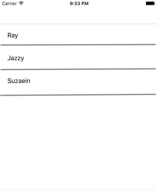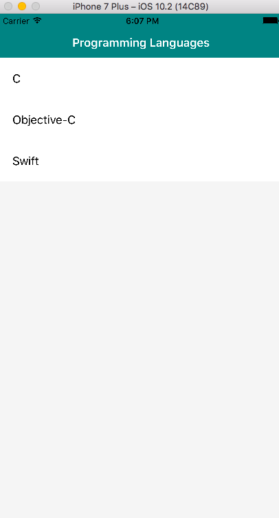 import UIKit class ViewController: UIViewController, UITableViewDelegate, UITableViewDataSource { private let myArray: NSMutableArray = ["C","Objective-C","Swift"] private var myTableView: UITableView! override func viewDidLoad() { super.viewDidLoad() self.view.backgroundColor = UIColor.init(red: 245/255.0, green: 245/255.0, blue: 245/255.0, alpha: 1.0); self.navigationItem.title = "Programming Languages" self.navigationController?.navigationBar.barTintColor = UIColor.init(red: 0/255.0, green: 128/255.0, blue: 128/255.0, alpha: 1.0) self.navigationController?.navigationBar.titleTextAttributes = [NSForegroundColorAttributeName: UIColor.white] self.navigationController?.navigationBar.tintColor = UIColor.white myTableView = UITableView(frame: CGRect(x: 0, y: 0, width: UIScreen.main.bounds.size.width, height: self.view.frame.height - 60)) myTableView.register(UITableViewCell.self, forCellReuseIdentifier: "cell") myTableView.dataSource = self myTableView.delegate = self myTableView.backgroundColor = UIColor.clear myTableView.separatorStyle = UITableViewCellSeparatorStyle.none self.view.addSubview(myTableView) } func numberOfSectionsInTableView(tableView: UITableView) -> Int { return 0 // you should probably return 1 } func tableView(_ tableView: UITableView, numberOfRowsInSection section: Int) -> Int { return myArray.count } func tableView(_ tableView: UITableView, didSelectRowAt indexPath: IndexPath) { print("Num: (indexPath.row)") print("Value: (myArray[indexPath.row])") } func tableView(_ tableView: UITableView, cellForRowAt indexPath: IndexPath) -> UITableViewCell { let cell = tableView.dequeueReusableCell(withIdentifier: "cell", for: indexPath as IndexPath) cell.textLabel!.text = "(myArray[indexPath.row])" return cell } func tableView(_ tableView: UITableView, heightForRowAt indexPath: IndexPath) -> CGFloat { return 60 } }